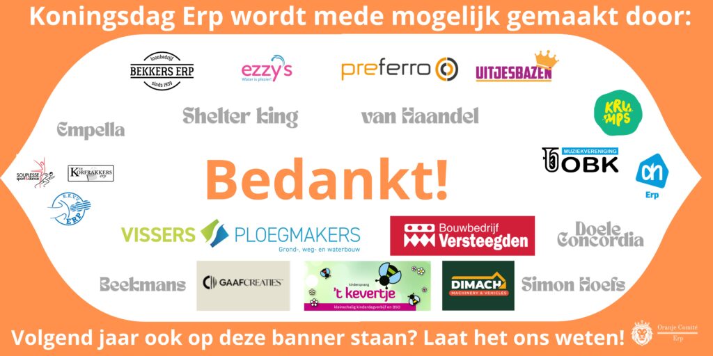 We bedanken onze sponsoren voor hun bijdrage om Koningsdag in Erp tot een succes te maken! Koningsdag Erp ook een warm hart toedragen? Meld je via oranje.comite.erp@gmail.com